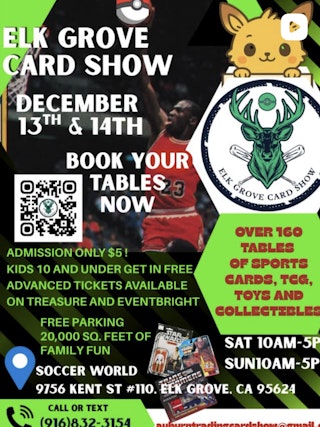 Welcome to The Elk Grove Card Show! Join us December 13th 10:00 AM to 6:00 PM and the 14th from 10:00 AM to 5:00 PM at Soccer World in Elk Grove for a weekend full of trading, buying, and selling cards and collectibles.
