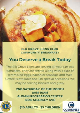 Join Elk Grove Lions Club as they prepare a breakfast feast for you! Enjoy all of this: