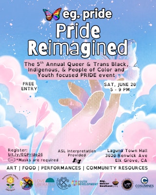 Elk Grove Pride (EG pride) is a community-led LGBTQIA+ and youth-centered celebration organized by Sacramento Filipinx LGBTQIA+ and EG Pride Coalition. Its purpose is to showcase and support Black, Indigenous, and People of Color (BIPOC) LGBTQIA+ organizations, artists, and creatives, while also providing resources for youth in Elk Grove and the surrounding Sacramento areas.