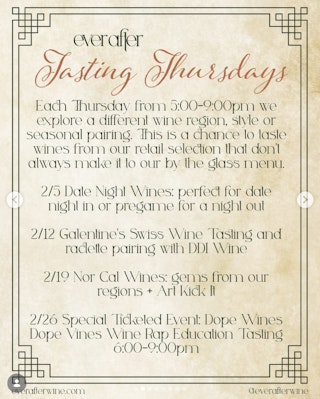 Each Thursday from 5-9pm, we explore a different wine region, style, or seasonal pairing. Come taste wines perfect for a date night or pregame for a night out.