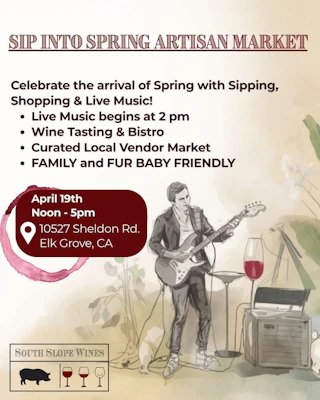 Mark your calendars! We're kicking off spring with a curated artisan market featuring local vendors, live music starting at 2pm, wine tasting, and our full bistro menu. It's family and fur-baby friendly, so bring everyone for an afternoon of shopping, sipping, and soaking up the good vibes.