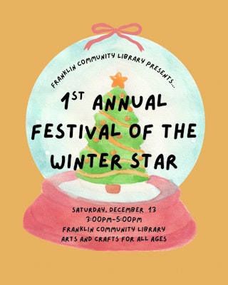 Join us at Franklin Community Library to celebrate the winter season at our first Festival of the Winter Star. Explore the history of our Winter Star by completing fun arts, crafts and activities to earn clues that will help you discover the magical secrets of the Winter Star. There will be snacks and winter-themed movies playing, and all ages are welcome!