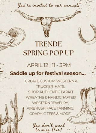 @witgritgrace will have a super cute HAT BAR set up & you’ll create your very own custom HAT! Choose from western rancher styles OR trucker hats.Add accessories from bands, feathers flowers and charms or patches & more! Perfect for upcoming festivals, concerts, vacations…anything!***RSVP for a hat time to guarantee your spot! 3-4 people per time slot...come with a friend /group or we’ll partner you up with another TrendE babe! Walk-ins will be accommodated as available! ALSO bringing her authentic lariat wreathes!